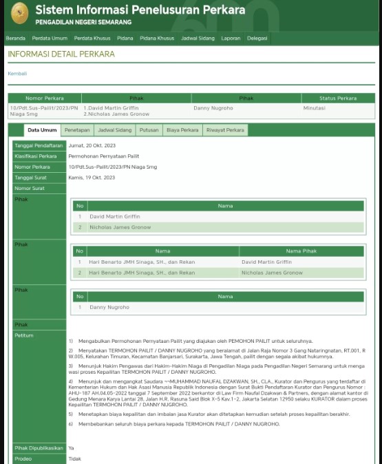 Berdasarkan informasi yang dihimpun, gugatan tersebut diajukan oleh dua pihak, yakni David Griffin dan Nicholas James Gronow. Gugatan itu resmi didaftarkan pada 20 Oktober 2023 dan tercatat dengan nomor perkara 10/Pdt.Sus-Pailit/2023/PN.Niaga.Smg.