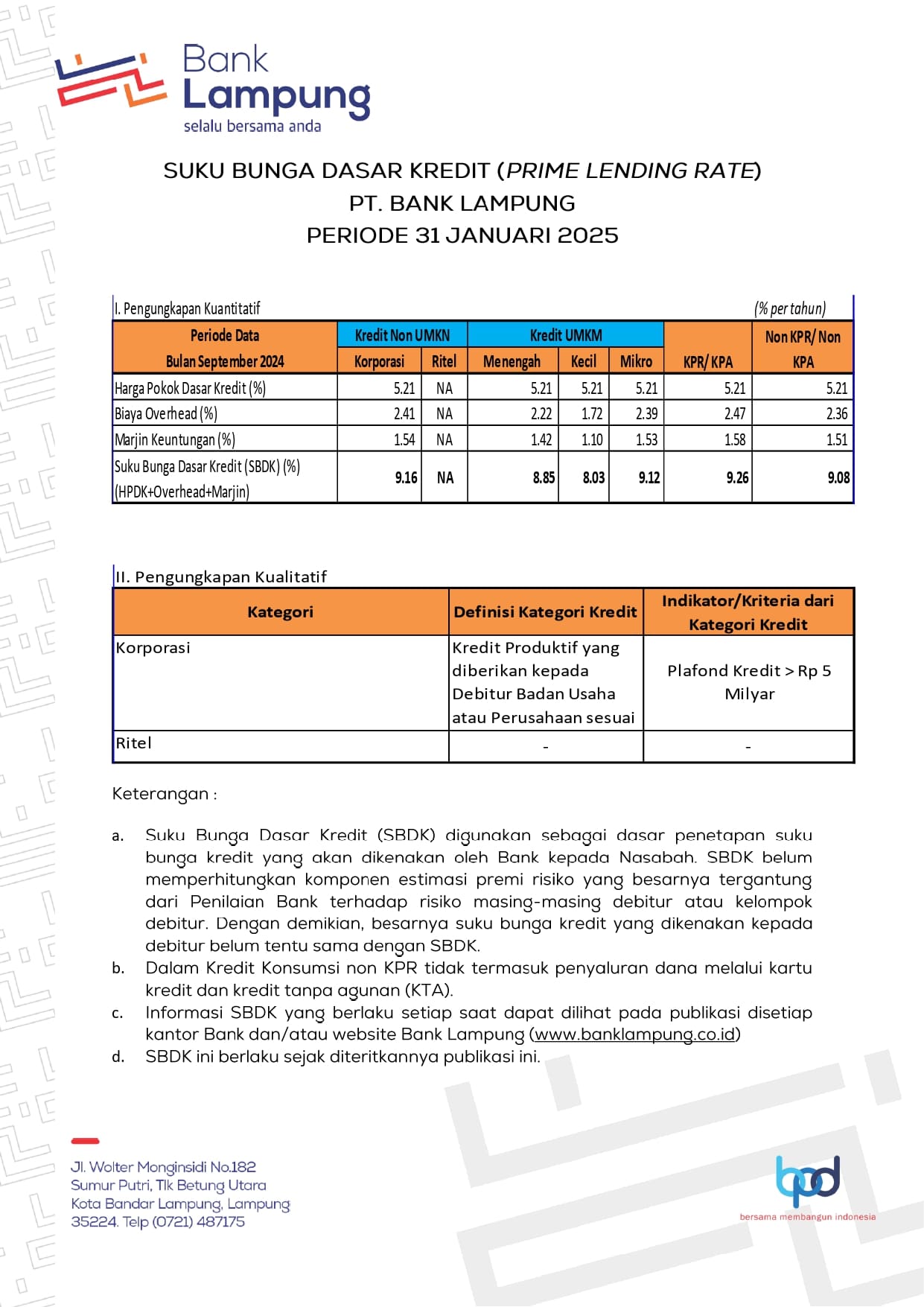 Ini Besaran Suku Bunga Dasar Kredit Bank Lampung Periode Januari 2025