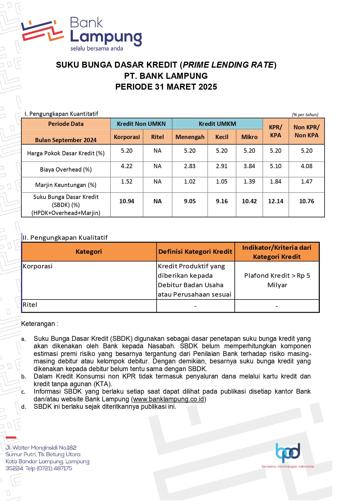 Beranda Ekonomi Ini Besaran Suku Bunga Dasar Kredit Bank Lampung Periode 31 Maret 2025 Ekonomi, News Ini Besaran Suku Bunga Dasar Kredit Bank Lampung Periode 31 Maret 2025Senator10 April 202510 Juni 2025 Navigasi pos Pos sebelumnya Sampah Asal Lampung Tengah Dibuang ke TPA Kota Metro, Warga Diamankan!Pos selanjutnya DPD ASWIN Provinsi Lampung Luncurkan Program Koperasi Jasa Wartawan “WARTA INDO NIAGA” Baca JugaPengguna LRT Jabodebek Tumbuh 26% di Januari 2026, Tunjukkan Pergeseran Mobilitas Perkotaan di JabodebekTransformasi Digital Perkuat Kinerja Operasional IPCC Terminal KendaraanDinamika Awal Tahun, BRI Finance Terapkan Strategi Pembiayaan KompetitifGenap Setahun Beroperasi, KA Gunungjati Angkut 248 Ribu Penumpang dari Daop 1 JakartaKAI Daop 9 Jember Perkuat Keselamatan Perjalanan KA melalui Upgrade Prasarana Sepanjang 2025Masuki Masa Transisi Pemulihan Pascabencana, Kementerian PU Lanjutkan Program Rehabilitasi Infrastruktur Dasar di Provinsi Aceh
