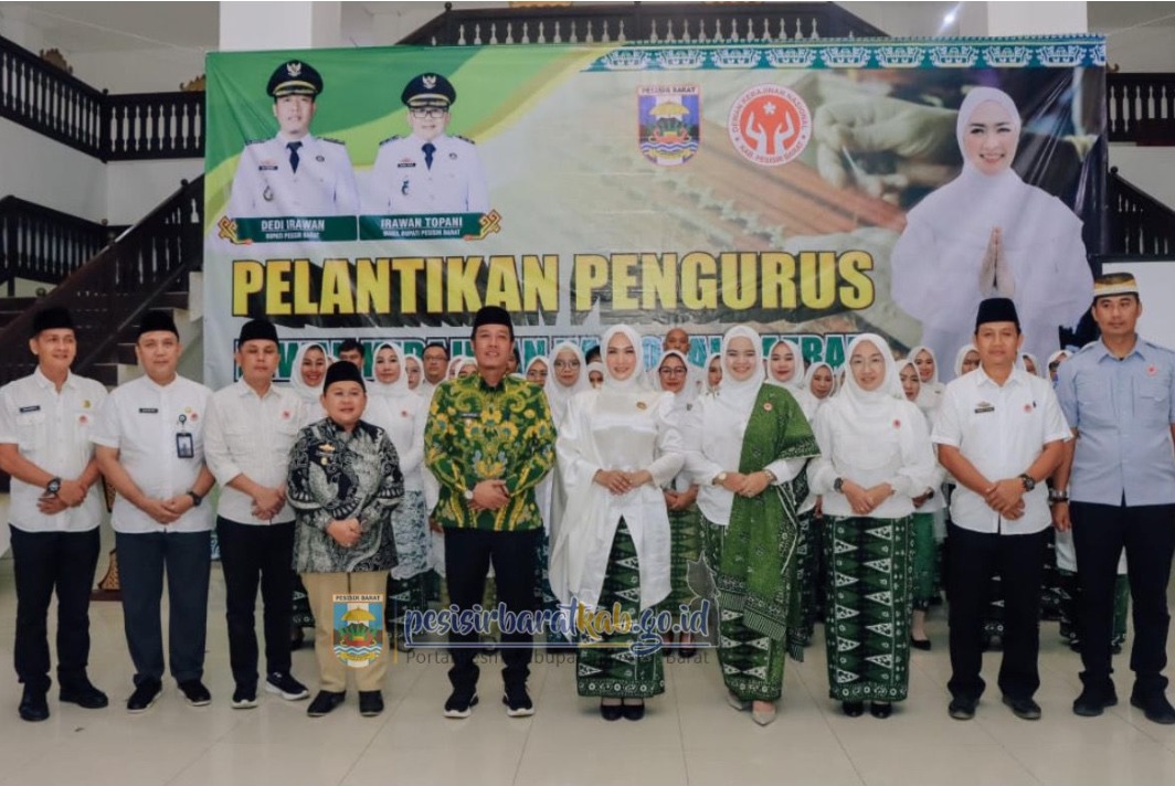 PESISIR BARAT- Ketua Dewan Kerajinan Nasional Daerah (Dekranasda) Kabupaten Pesisir Barat (Pesibar), Dian Hardiyanti Dedi, S.ST., M.M., melantik pengurus Dekranasda Pesibar Masa Bakti 2025-2030, di ruang lobi Lantai 1 Gedung Marga Sai Batin Komplek Perkantoran Pemkab Pesibar, Jumat (9/5/2025).