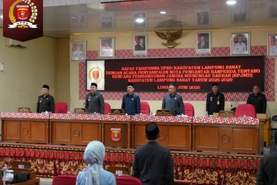 LAMBAR- Dewan Perwakilan Rakyat Daerah (DPRD) Kabupaten Lampung Barat menggelar rapat paripurna dengan agenda utama penyampaian pandangan umum fraksi-fraksi terhadap Rancangan Peraturan Daerah (Ranperda) tentang Rencana Pembangunan Jangka Menengah Daerah (RPJMD) Tahun 2025–2029.