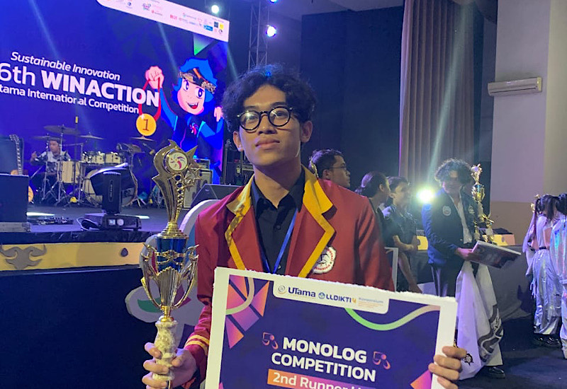 BANDUNG- Yoan Meyral Sinaga, mahasiswa angkatan 2023 Sastra Inggris Fakultas Sastra dan Ilmu Pendidikan Universitas Teknokrat Indonesia, menjadi juara ketiga atau 2nd runner up cabang monolog The 6th Widyatama International Competition, 28 Mei 2025.