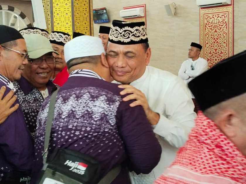 METRO- Suasana haru dan terlihat saat Wali Kota Metro Bambang Iman Santoso menyambut kepulangan jamaah haji Kloter 28 JKG yang meliputi Kota Metro dan Lampung Timur di Masjid Agung Taqwa Kota Metro, Minggu (22/06/2025).