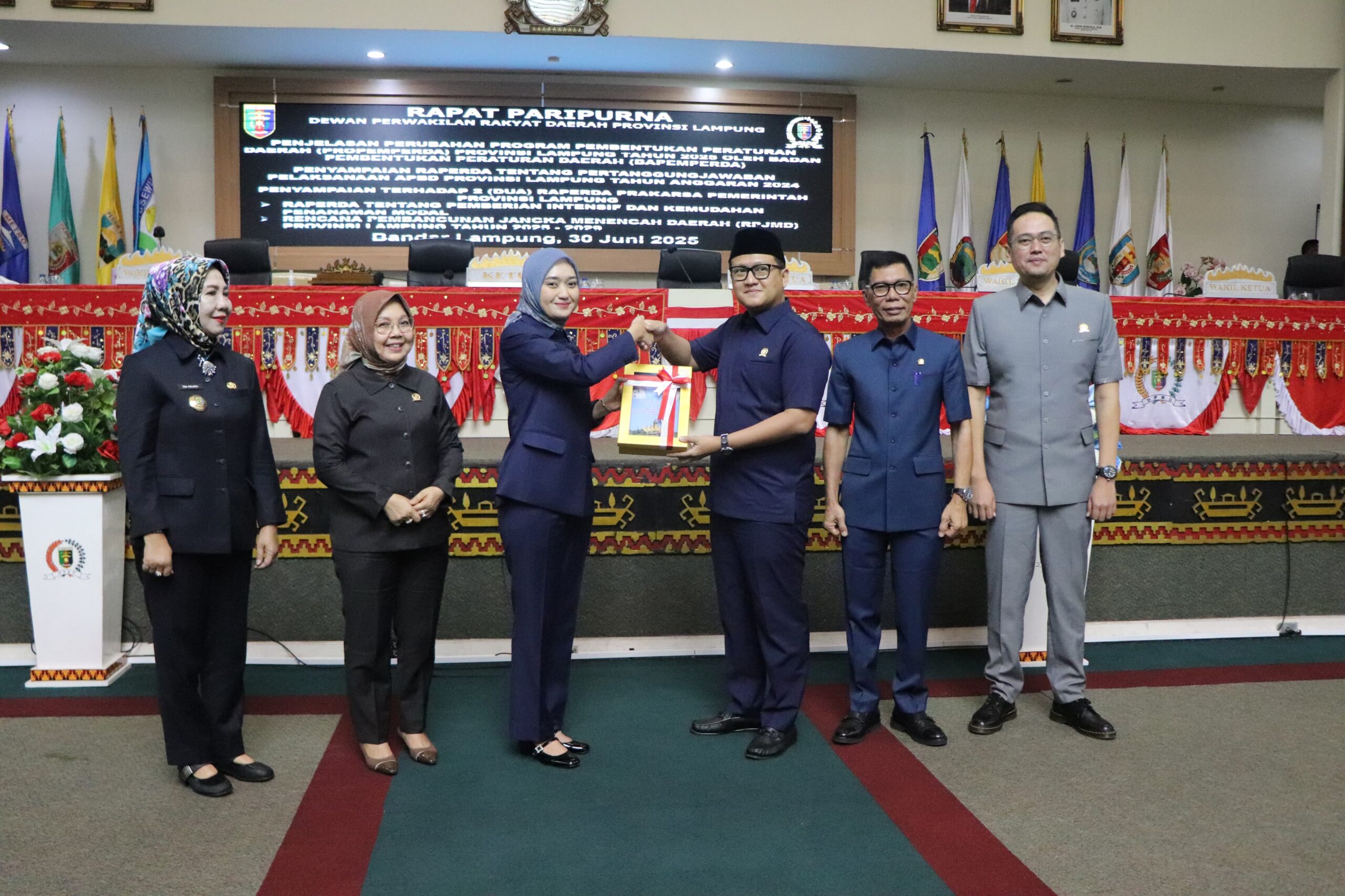 Rapat Paripurna DPRD Provinsi Lampung dilaksanakan dalam rangka Penjelasan Pembentukan Perubahan Program Peraturan Daerah (PROPEMPERDA) Provinsi Lampung Tahun 2025 oleh Badan Pembentukan Peraturan Daerah (BAPEMPERDA), Pembicaraan Tingkat I Penyampaian Raperda tentang Pertanggungjawaban Pelaksanaan APBD Provinsi Lampung Tahun Anggaran 2024 serta Pembicaraan Tingkat I Penyampaian terhadap 2 (Dua) Raperda Prakarsa Pemerintah Provinsi Lampung.