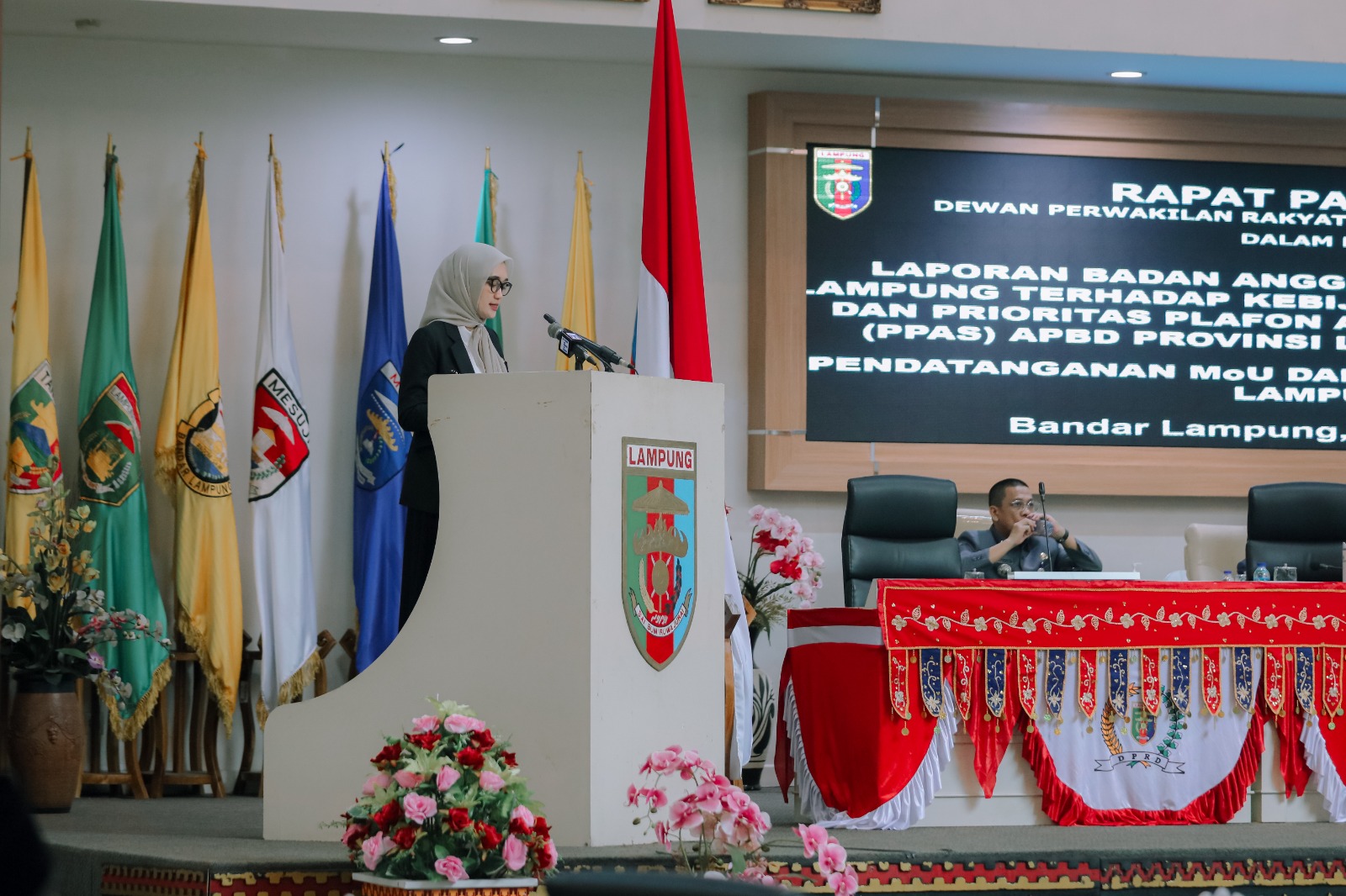 Dalam sambutannya, Wagub Jihan menyampaikan bahwasannya Rapat Paripurna ini merupakan tahap lanjutan dari pembahasan antara Pemerintah Daerah dan DPRD dalam memformulasikan Kebijakan Umum APBD; serta prioritas program/kegiatan pembangunan daerah yang akan menjadi bagian dalam menyusun Rancangan Peraturan Daerah tentang APBD Provinsi Lampung Tahun Anggaran 2026.