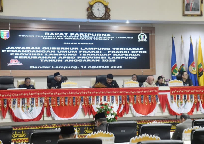 LAMPUNG- DPRD Provinsi Lampung menggelar Rapat Paripurna Lanjutan Pembicaraan Tingkat I terkait Jawaban Gubernur atas Pemandangan Umum Fraksi-Fraksi mengenai Rancangan Peraturan Daerah (Raperda) Perubahan APBD Provinsi Lampung Tahun Anggaran 2025, Rabu (13/8/25) di Ruang Rapat Paripurna DPRD Provinsi Lampung.