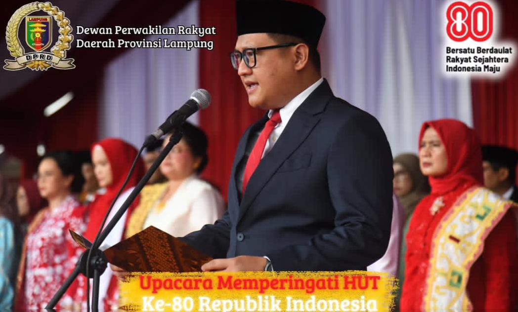 Bandar Lampung- Ketua DPRD Provinsi Lampung Ahmad Giri Akbar, SE., M.B.A. mengikuti Upacara Peringatan HUT ke-80 Kemerdekaan Republik Indonesia, dalam hal ini bertugas memimpin Pembacaan Teks Proklamasi dihadapan seluruh peserta upacara.