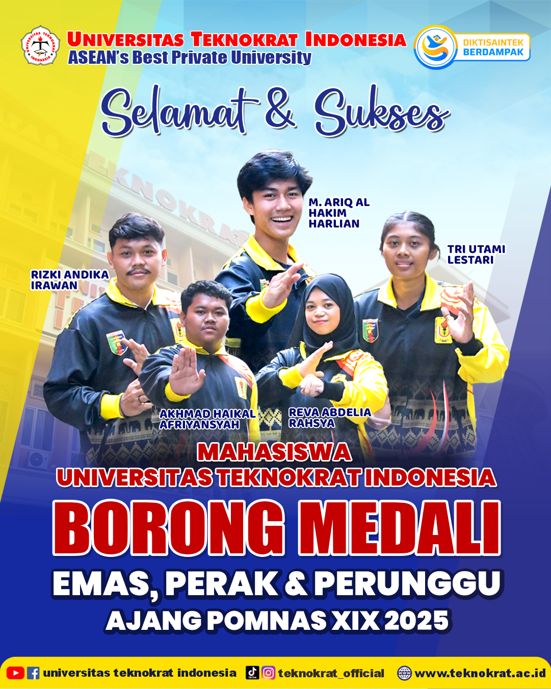 Dukungan penuh juga datang dari Pembina dan Ketua Yayasan Pendidikan Teknokrat yang senantiasa memberikan motivasi agar mahasiswa tidak hanya unggul dalam bidang akademik, tetapi juga mampu menorehkan prestasi di bidang olahraga. Hal ini sejalan dengan visi Universitas Teknokrat Indonesia sebagai kampus sang juara, baik dalam prestasi akademik, non-akademik, maupun pengabdian kepada masyarakat.