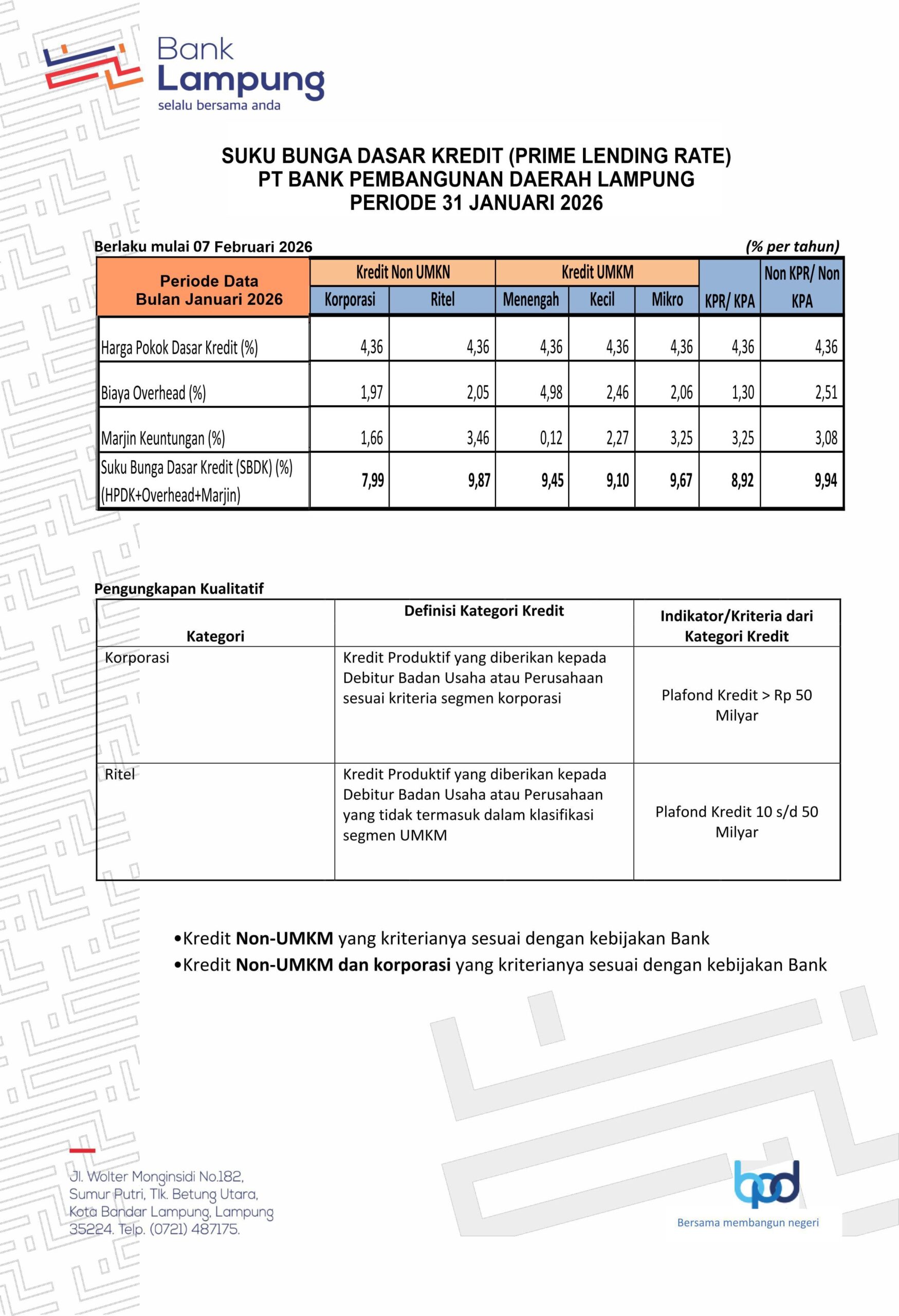 Ini Besaran Suku Bunga Dasar Kredit Bank Lampung Periode Januari 2026