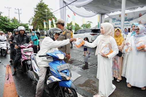 Memasuki hari kesebelas pelaksanaan kegiatan, ratusan paket takjil tetap dibagikan kepada masyarakat yang melintas menjelang waktu berbuka puasa. Meski sempat diguyur hujan, kegiatan tetap berlangsung aman, tertib, dan lancar.