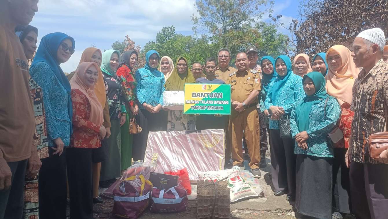 Tulang Bawang – Ketua Tim Penggerak Pemberdayaan dan Kesejahteraan Keluarga (TP PKK) Kabupaten Tulang Bawang, Ny. Herlinawati Qudrotul, berikan bantuan kepada korban kebakaran sebagai wujud empati dan komitmen sosial, di RT 005 / RW 003 Kampung Tri Tunggal Jaya, Kecamatan Banjar Agung, Kabupaten Tulang Bawang, Provinsi Lampung.