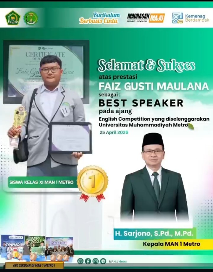 Kota Metro – Prestasi yang membanggakan kembali ditorehkan oleh siswa MAN 1 Metro dalam ajang kompetisi tingkat provinsi. Salah satu siswa terbaik MAN 1 Metro, Faiz Gusti Maulana, berhasil meraih Juara 1 kategori Best Speaker pada kegiatan English Competition yang diselenggarakan oleh Universitas Muhammadiyah Metro melalui UM Metro English Students Association (ASES UM Metro), Sabtu, 25 April 2026.
